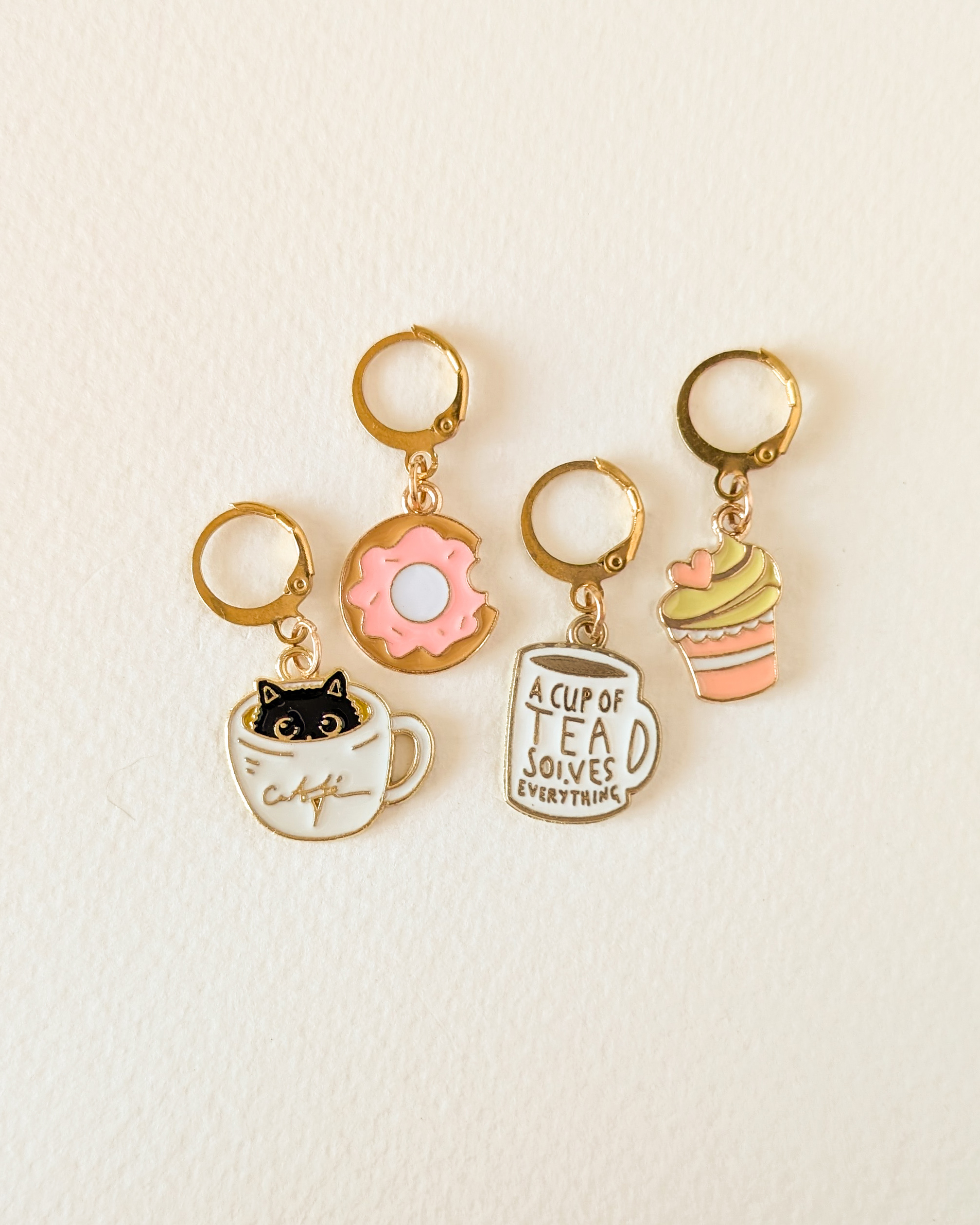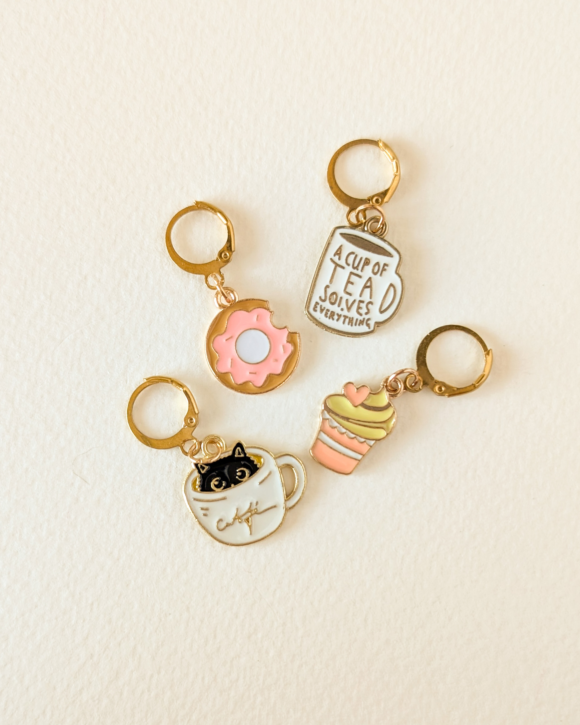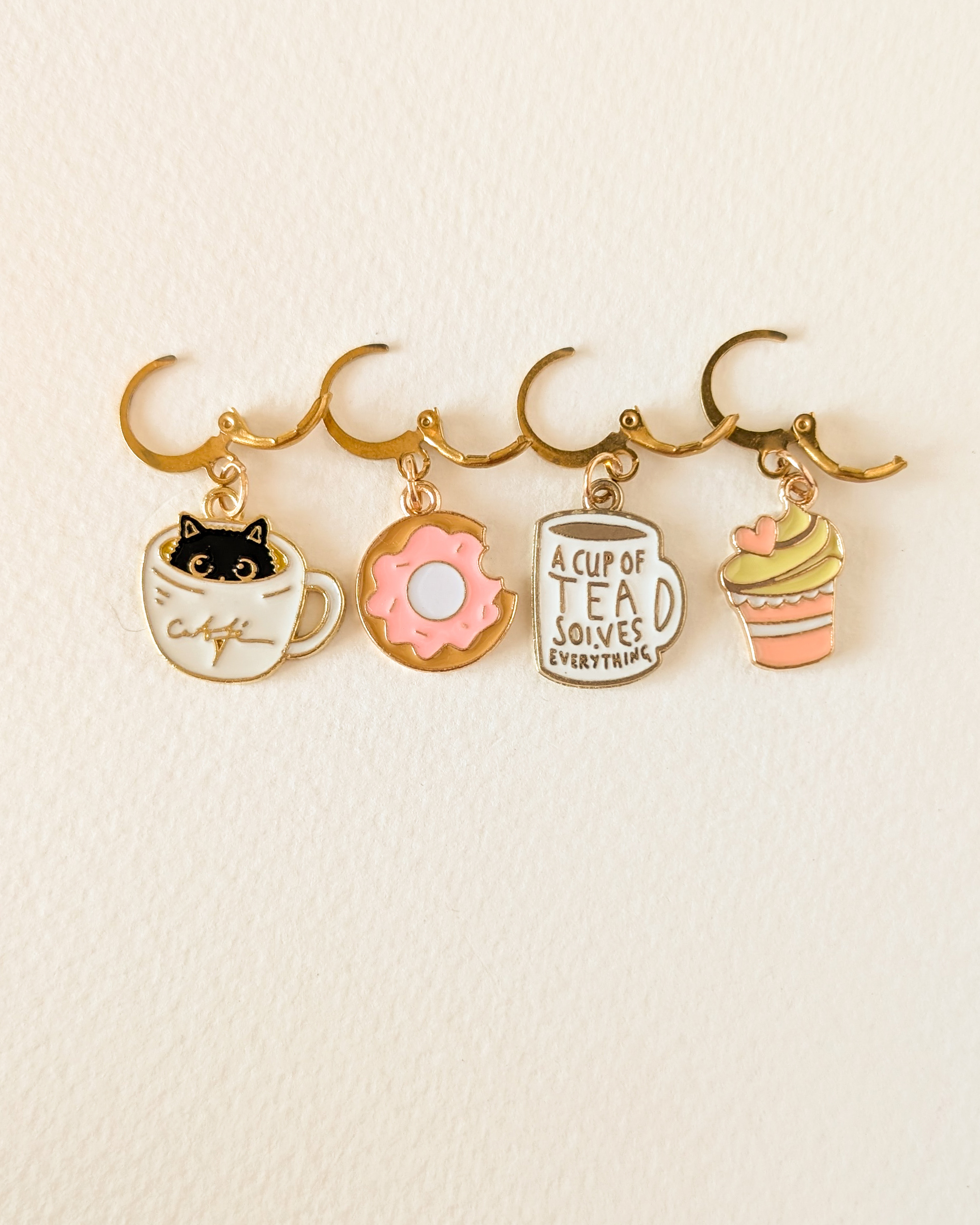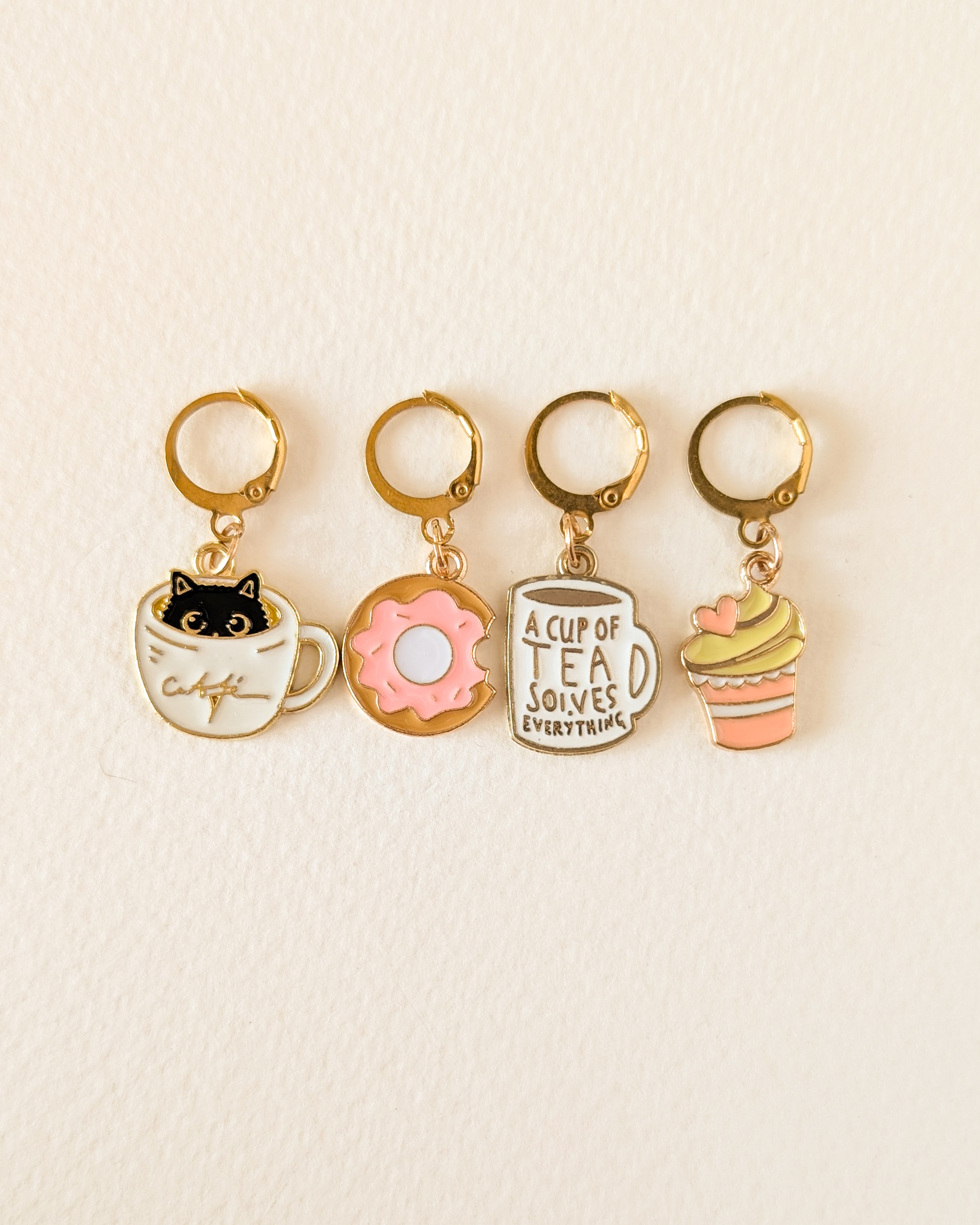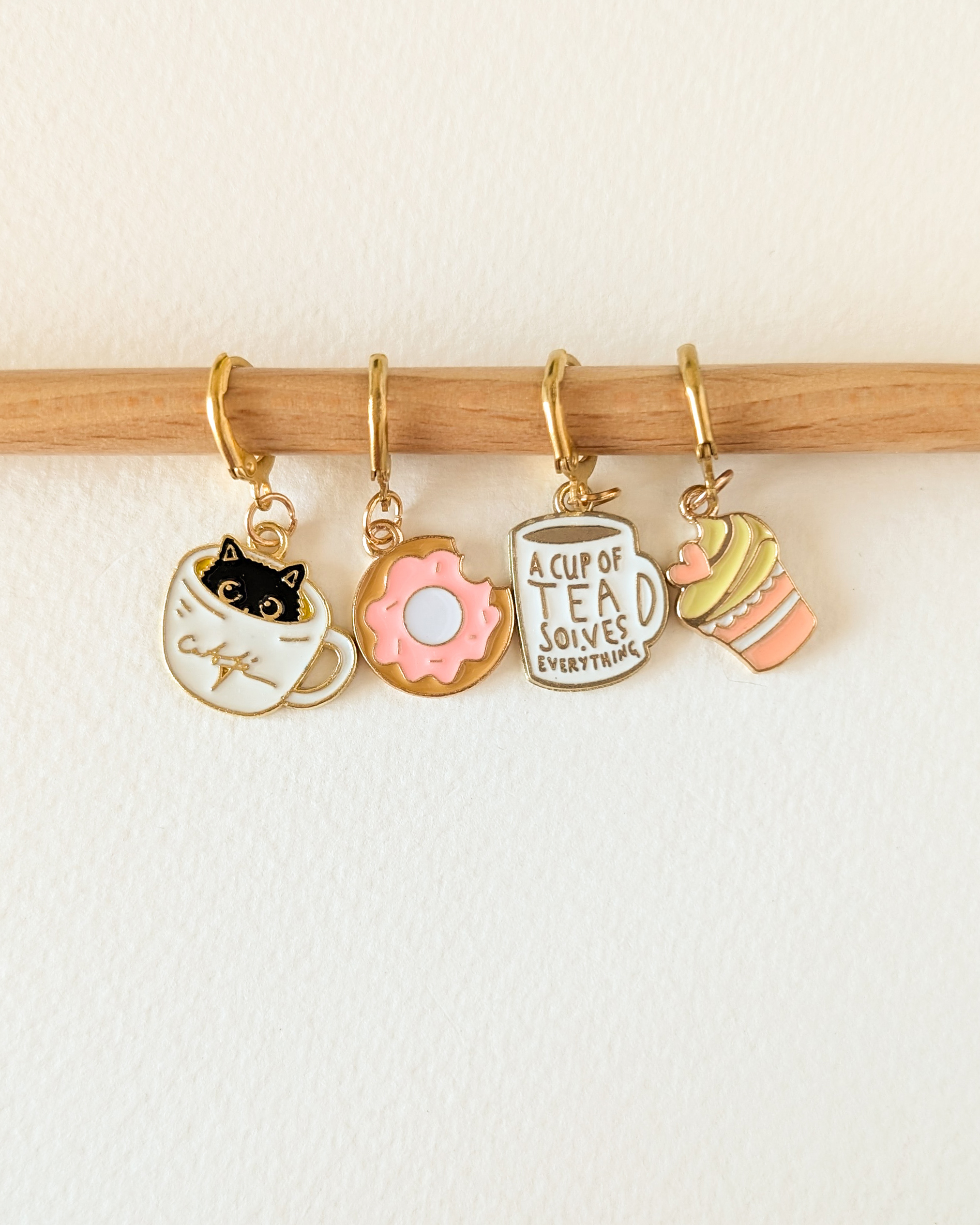 Le lot Pause gouter est composé de 4 anneaux marqueurs qui ajoutent une touche gourmande et sucrée à ton ouvrage.