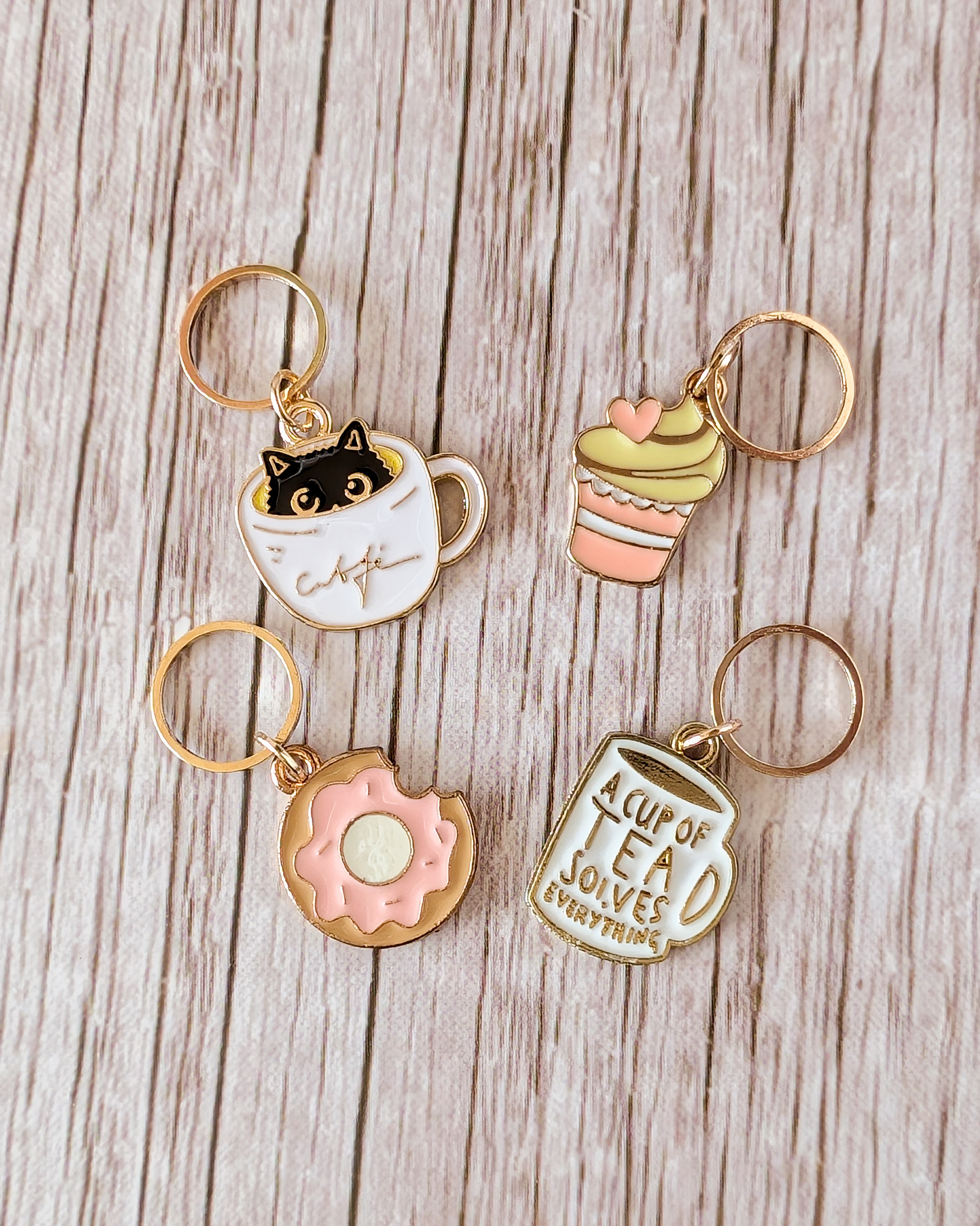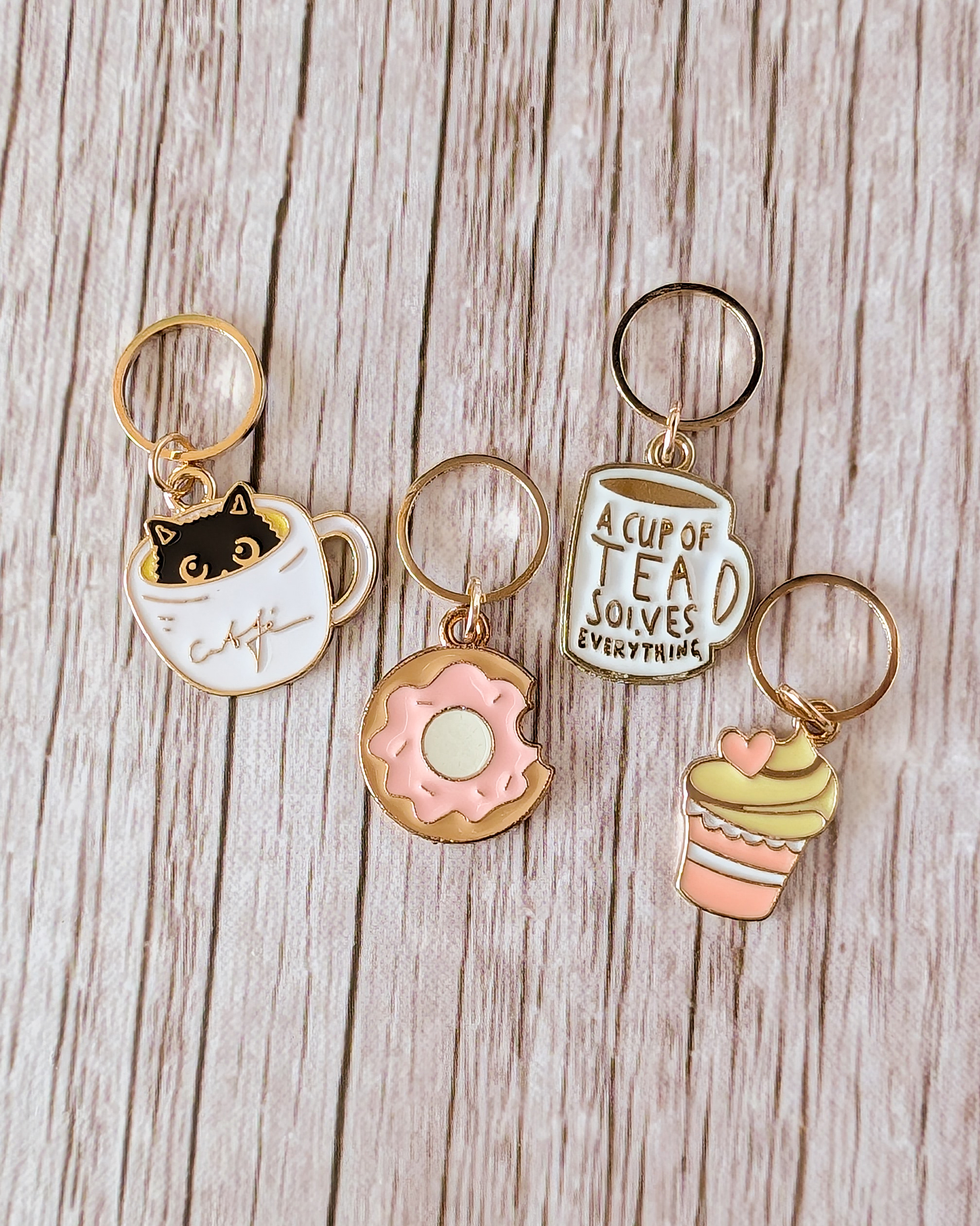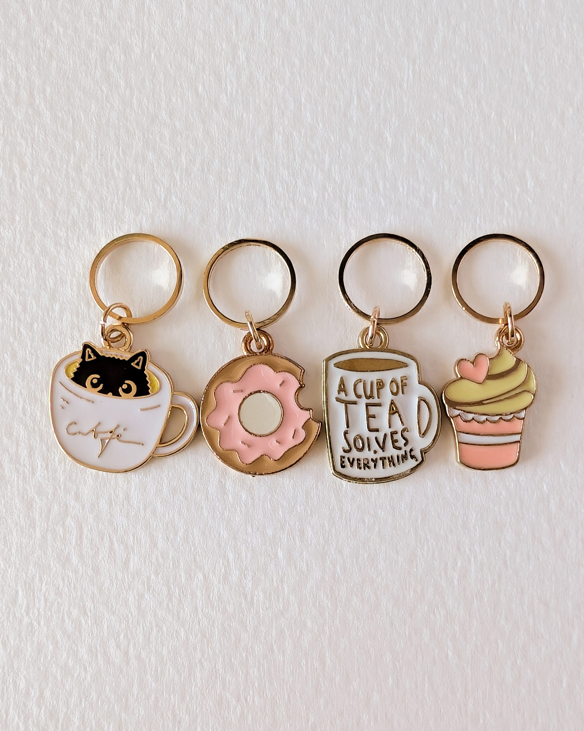 Le lot Pause gouter est composé de 4 anneaux marqueurs qui ajoutent une touche gourmande et sucrée à ton ouvrage.
