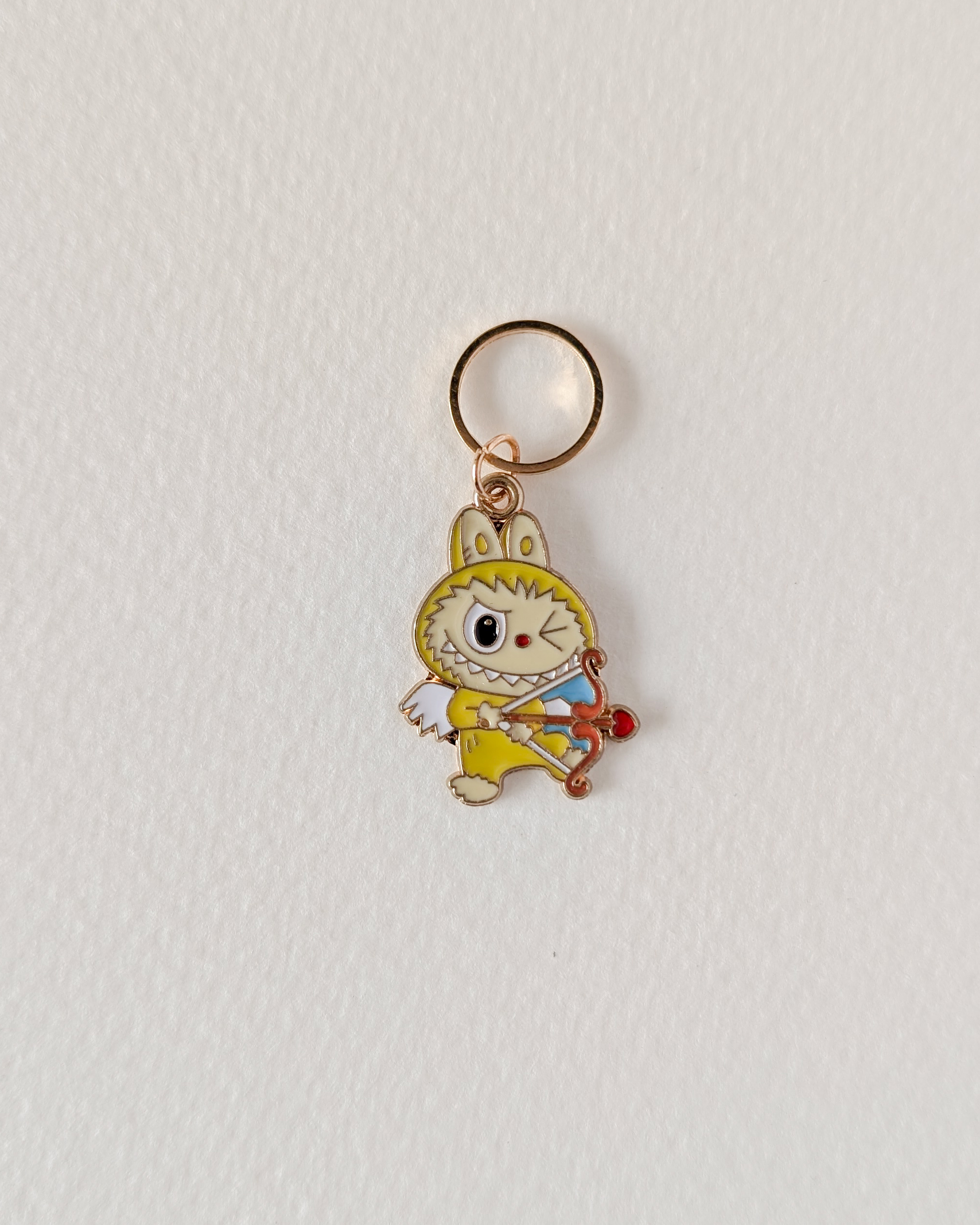 Labubu jaune avec un arc, une flèche coeur et des ailes