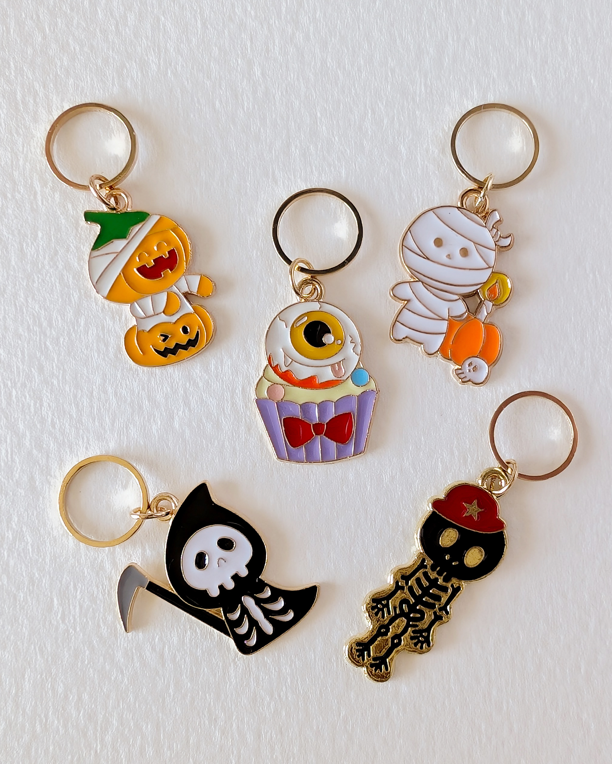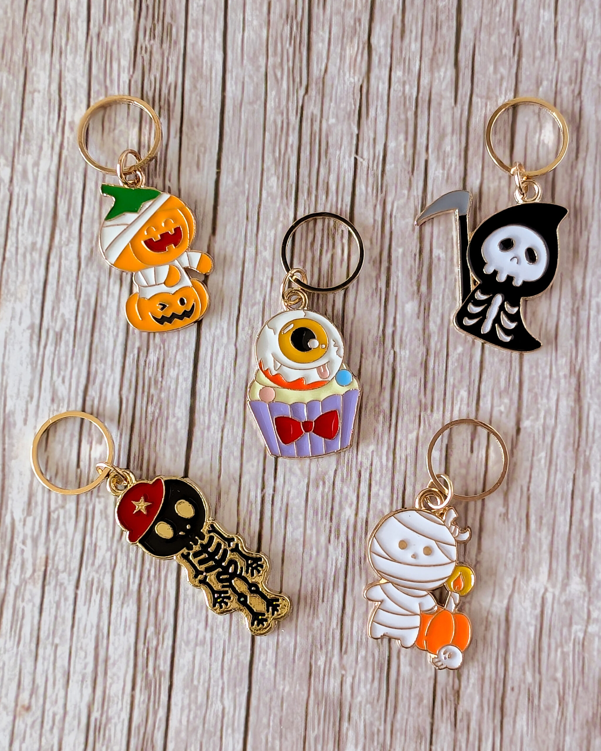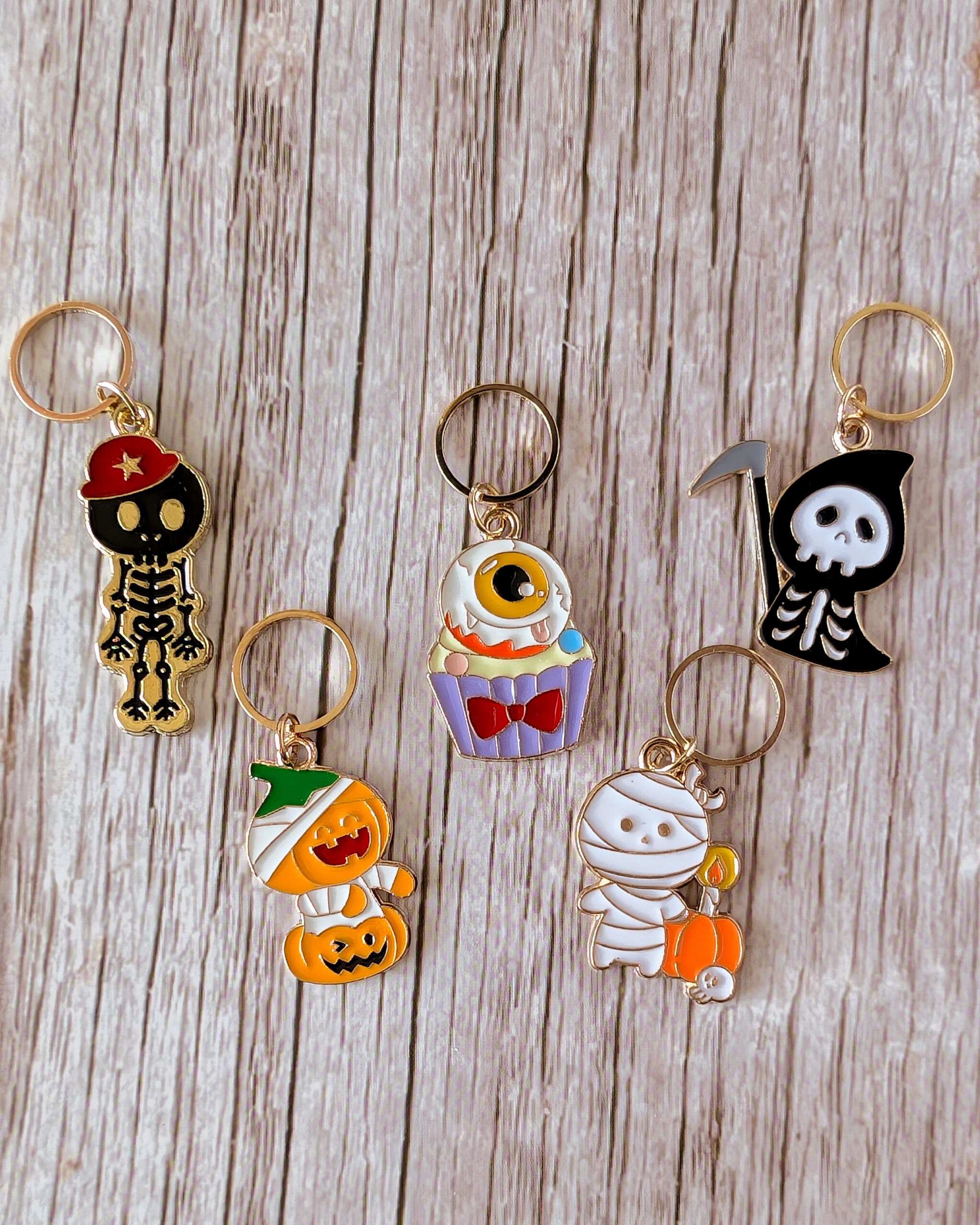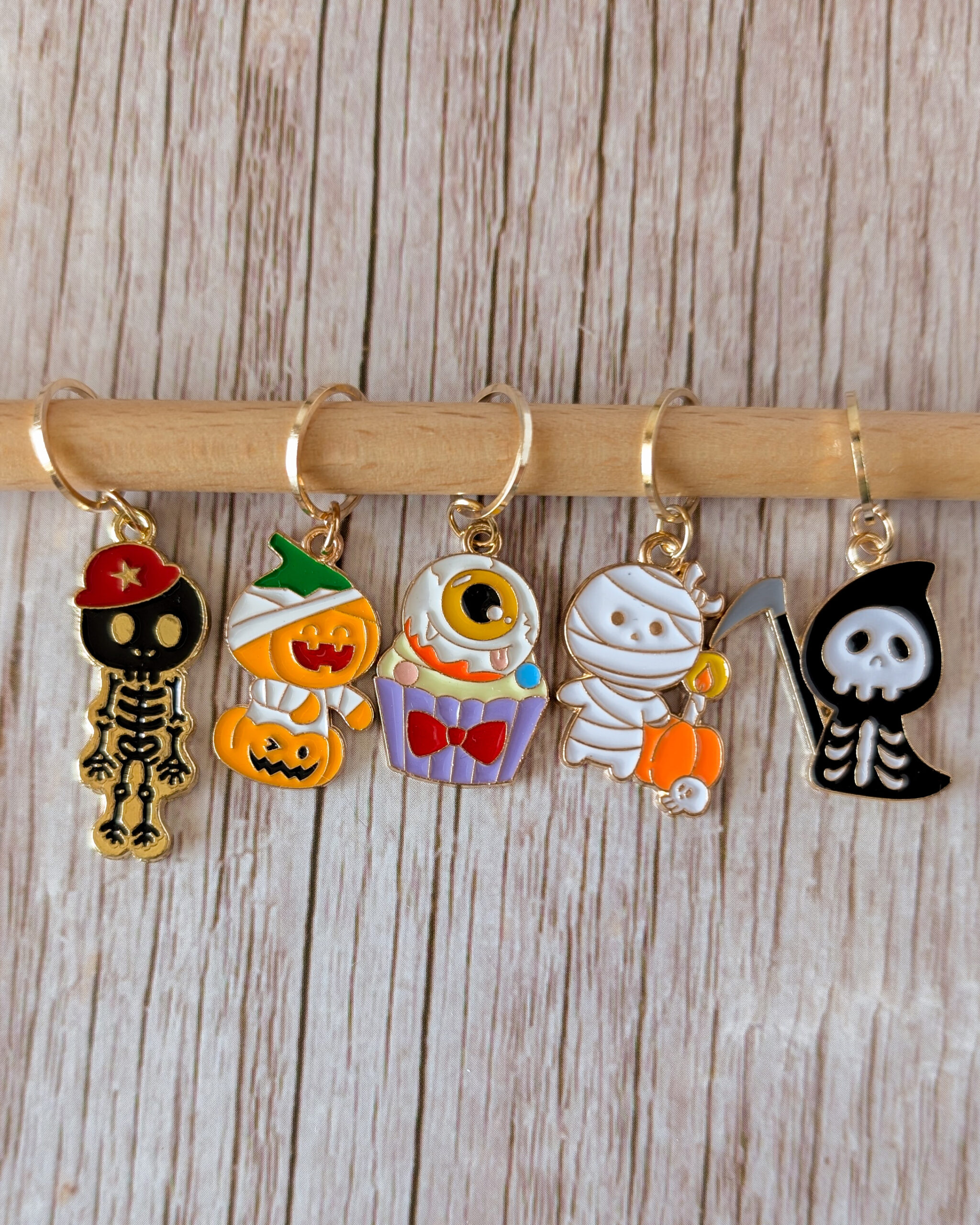 Le lot Halloween #2 est composé de 5 anneaux marqueurs qui ajoutent une automnale et effrayante à tes en-cours de tricot.