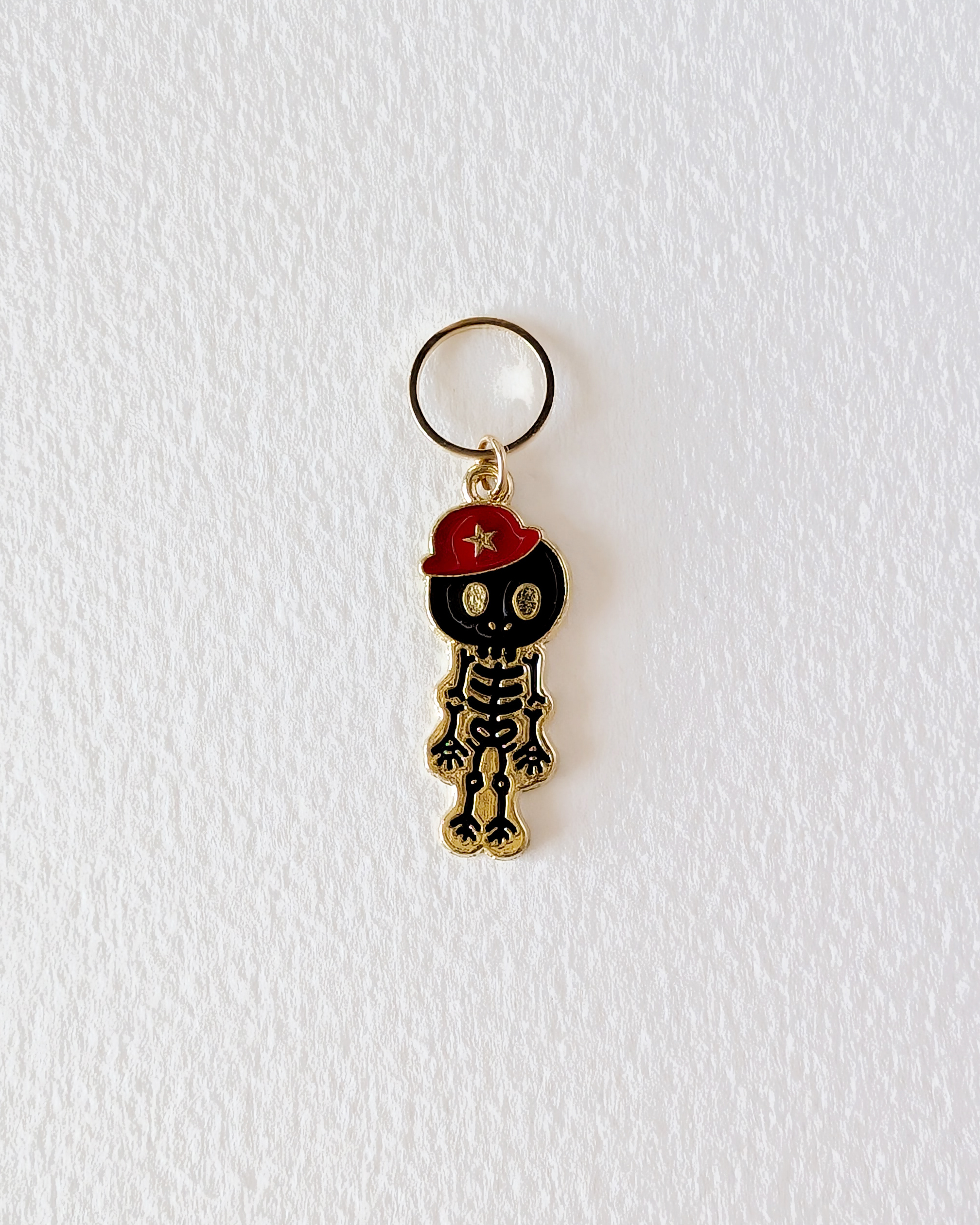 Squelette entier, noir sur fond doré, habillé d’un chapeau rouge