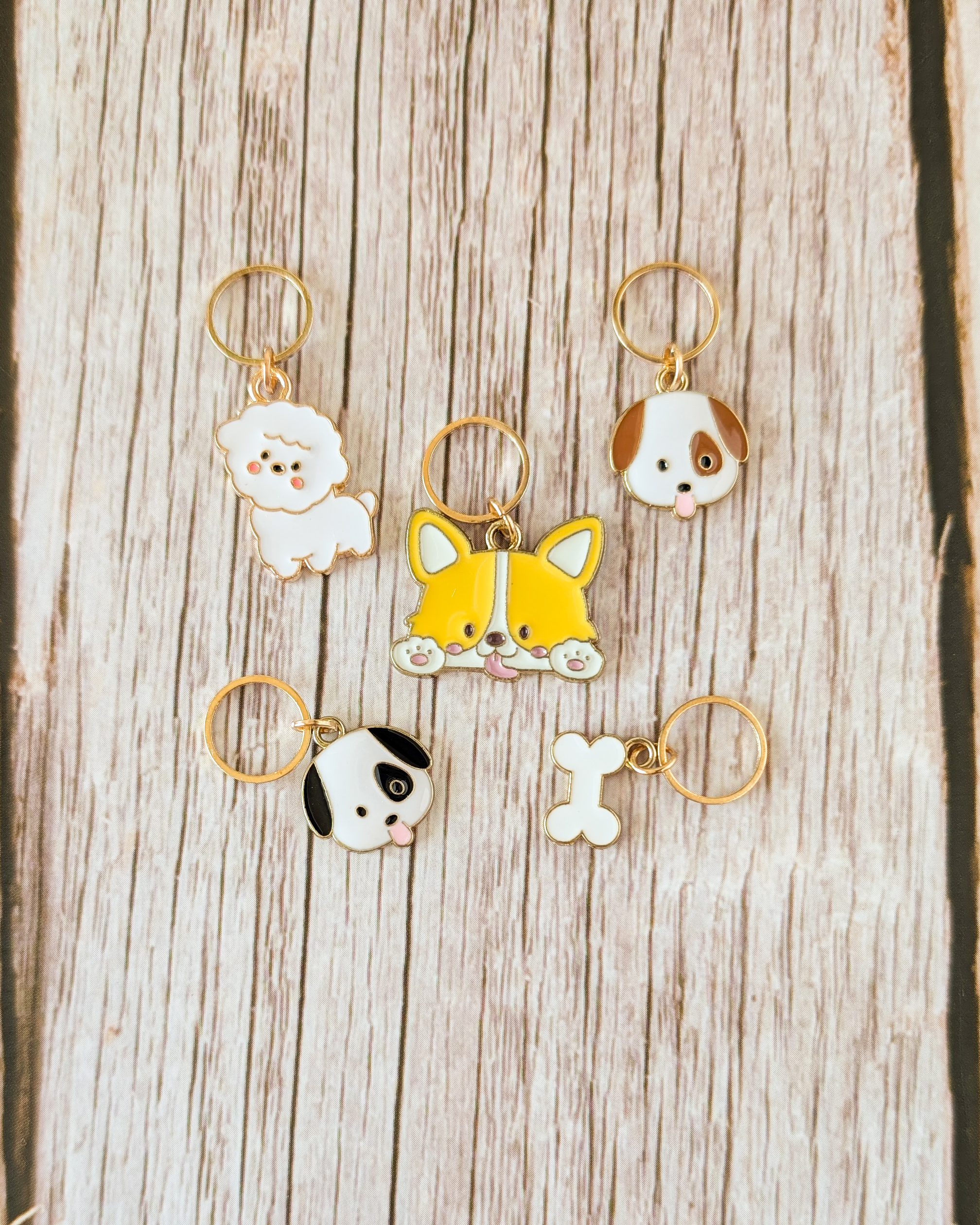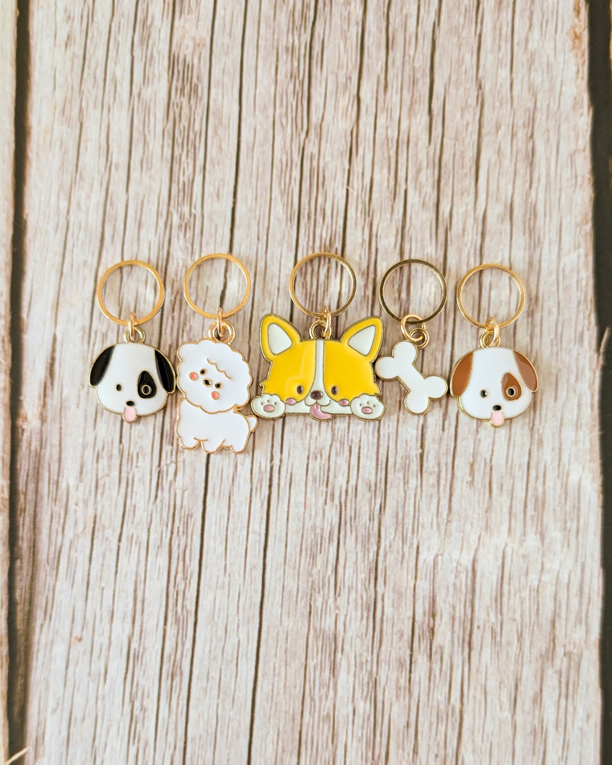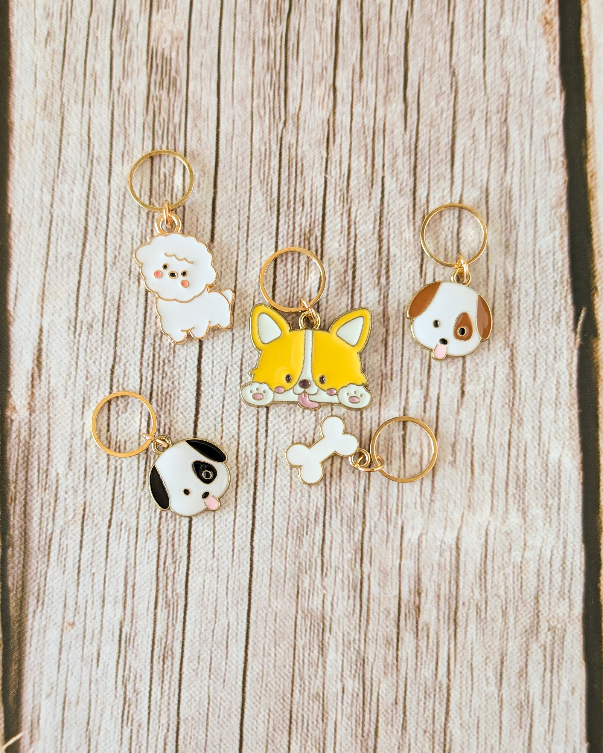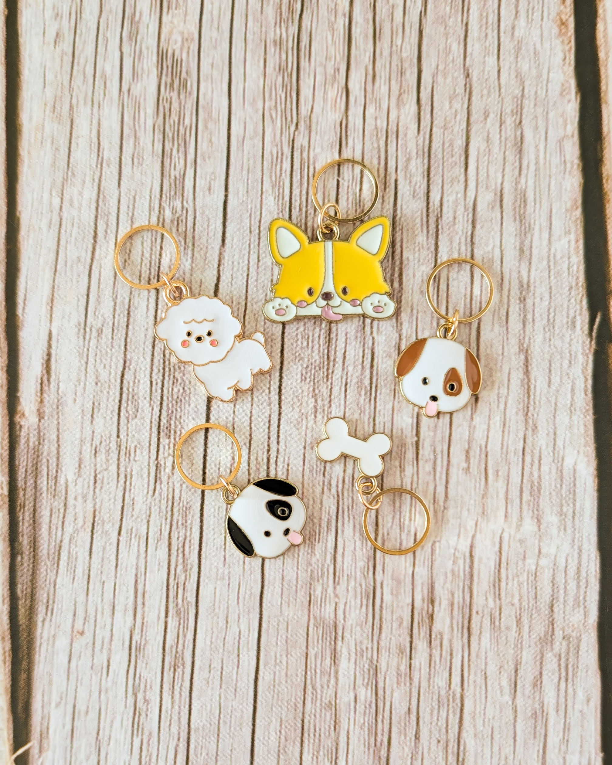 Le lot Petits chiens #1 est composé de 5 anneaux marqueurs qui ajoutent une touche canine à tes en-cours.