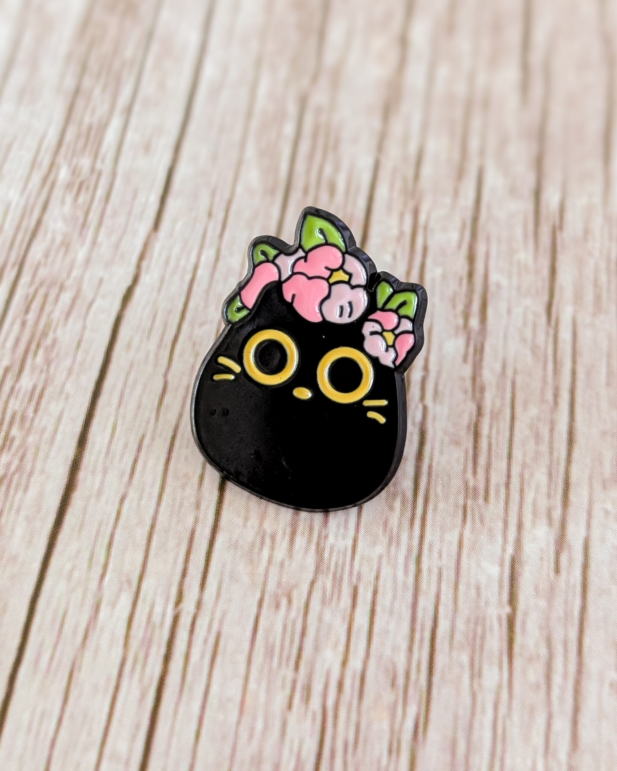Joli pin’s représentant un chat noir avec des fleurs sur la tête